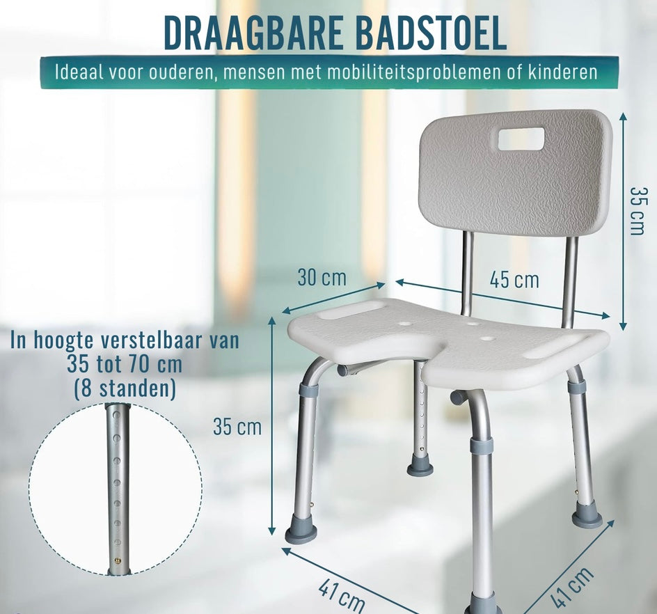 Met deze verstelbare douchestoel kunt u veilig en comfortabel zittend douchen. De stevige rugleuning en antislip poten zorgen voor extra stabiliteit, zodat u meer zekerheid heeft tijdens het douchen.